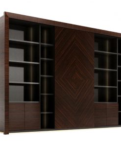 Стенка с открытыми полками, четырьмя распашными дверцами, двумя выдвижными ящиками и нишей под TV с центральной раздвижной дверцей. Основание выполнено из металла. Центральная дверца декорирована инкрустацией. Возможны другие варианты отделки. Подсветка заказывается дополнительно