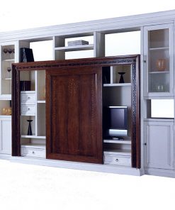Стенка с раздвижной дверцей. Украшена резьбой и инкрустацией. Возможны другие варианты отделки.