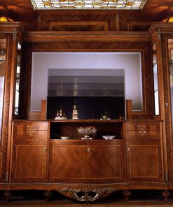 Стенка с тумбой под TV и витринами, декорированная резьбой. Структура — орех, инкрустация кленом