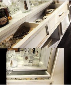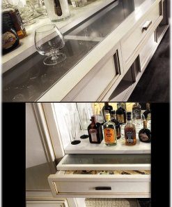 Модульная стенка с 4-мя раздвижными дверцами. Стенка разделена на 2 зоны: 1 зона TV и 2 зона бара. В композицию входят: книжные полки, ниша под TV, бар со стеклянными полками и зеркальной панелью, 2 ящика. Возможны другие варианты отделки.