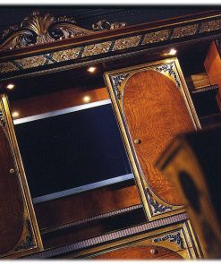 Стенка с витринами и книжными полками, в цетре отдел под TV с раздвижными дверцами. Декорирована резными элементами. Возможны другие варианты отделки
