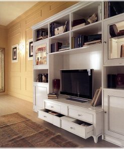 Модульная стенка. Композиция состоит: тумба под TV с 2-мя ящиками, 2 маленькие витрины с подсветкой, 2 деревянные дверцы, открытые полки. Возможны другие варианты отделки.