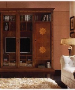 Стенка с 2-мя раздвижными стеклянными дверьми и 2-мя распашными деревянными дверьми. В композицию входят: тумба под TV с ящиком и нишами, открытые полки. Декорирована резьбой. Возможны другие варианты отделки.