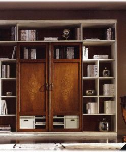 Стенка с 2-мя раздвижными дверьми. В композицию входят: тумба под TV с 4-мя ящиками и 3-мя нишами, открытые полки. Декорирована резьбой. Возможны другие варианты отделки.