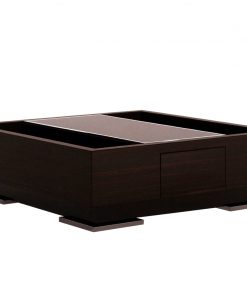 Журнальный стол с выдвижным ящиком и двумя открытыми контейнерами. Столешница выполнена из крашеного стекла. Ножки выполнены из металла. Возможен вариант стола с мраморной столешницей. Возможны другие варианты отделки