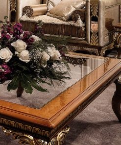 Журнальный стол с изогнутыми ножками и прямоугольной стеклянной столешницей. Декорирован резьбой