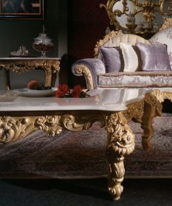 Прямоугольный журнальный стол, декорирован резными элементами ручной работы. Столешница выполнена из мрамора. Возможны другие варианты отделки.