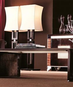Прямоугольный журнальный стол. Столешница выполнена из стекла. Декорирован кожей. Возможны другие варианты отделки.