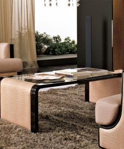Прямоугольный журнальный стол. Столешница выполнена из стекла. Декорирован кожей. Возможны другие варианты отделки.