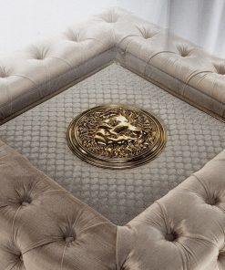 Журнальный стол со стеклянной столешницей с декором. Обит в технике капитоне. Возможны другие варианты отделки и обивки.