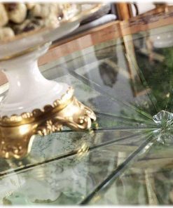 Квадратный журнальный стол, столешница декорирована стеклом. Ножки декорированы резьбой ручной работы. Инкрустация выполнена из перламутра.