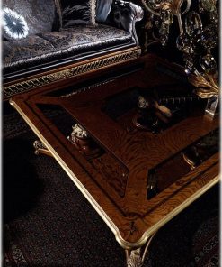 Квадратный журнальный стол. Столешница вполнена из стекла. Декорирован резьбой ручной работы. Отделка ясень крашенный в светлый или темный орех.