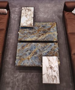 Журнальный стол с металлическим основанием, прямоугольной мраморной столешницей и полкой. Возможен вариант с зеркальной столешницей или выполненной из оникса. Основание может быть деревянным или обитым кожей. Возможны другие варианты отделки и обивки