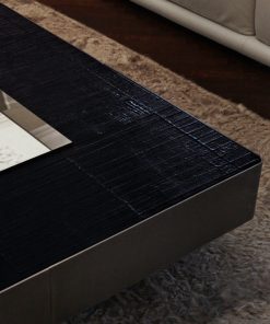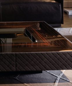 Журнальный стол с квадратной деревянной столешницей с зеркальным подносом в центре. Основание выполнено из металла. Столешницу или основание можно обить кожей. Возможны другие варианты отделки и обивки