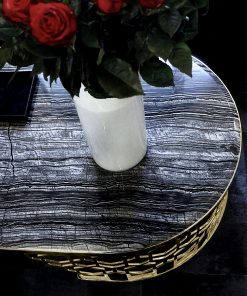Журнальный стол с фигурным металлическим основанием и овальной мраморной столешницей. Столешница может быть стеклянной, зеркальной или из оникса. Возможны другие варианты отделки