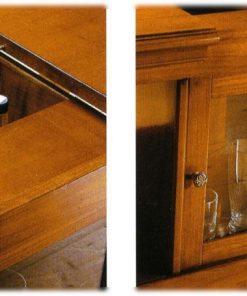 Прямоугольный журнальный столик с баром, 2-мя маленькими витринами и 2-мя полками. Декорирован резными элементами. Возможны другие варианты отделки.