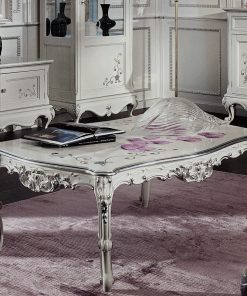 Прямоугольный журнальный стол со стеклянной столешницей. Декорирован росписью и резьбой. Возможны другие варианты отделки.