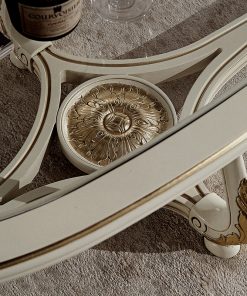 Овальный журнальный стол со стеклянной столешницей. Декорирован резьбой. Возможны другие варианты отделки.