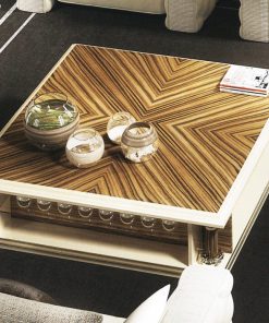 Журнальный стол с квадратной столешницей. Декорирован инкрустацией и резьбой. Оснащён стеклянными полками по бокам