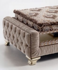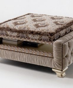 Прямоугольный журнальный стол. Трансформируется в пуф с мягким сидением. Боковины обиты в технике капитоне. Украшен бахромой. Возможны другие варианты отделки и обивки.