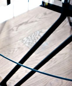 Обеденный стол с круглой стеклянной столешницей и фигурным металлическим основанием.