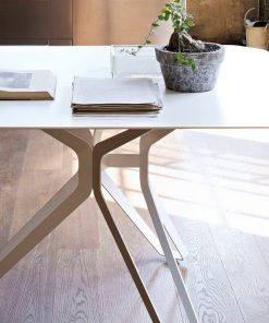 Обеденный металлический стол с прямоугольной столешницей и двумя фигурными ножками. Возможны другие варианты отделки.