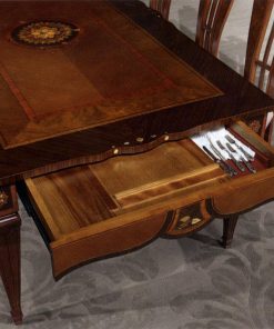 Стол раскладной, декорированный резьбой. Сбоку столешницы контейнер для столовых приборов. Структура — палисандровое дерево