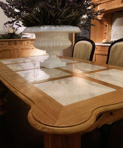 Прямоугольный обеденный стол с фигурными ножками. Столешница выполнена из дерева с вставками из мрамора. Возможны другие варианты отделки.