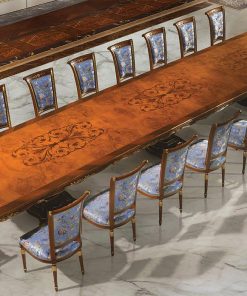 Обеденный стол с удлинённой прямоугольной столешницей и тремя фигурными ножками. Декорирован инкрустацией и резьбой. Возможны другие варианты отделки