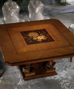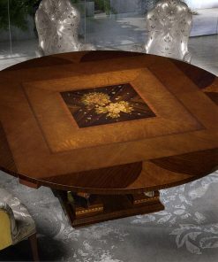 Стол раскладной. Благодаря дополнительным вставкам столешница становится круглой диаметром — 200 см. Фигурные ножки с зеркальными вставками. Возможны другие варианты отделки