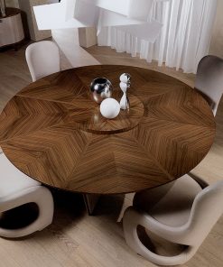 Круглый обеденный стол с обитым основанием, деревянной столешницей и вращающимся подносом LAZY SUSAN. Возможны другие варианты отделки и обивки.