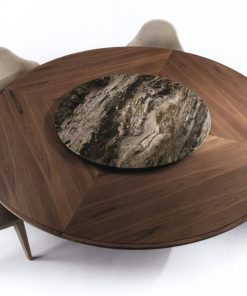 Обеденный стол с круглой столешницей с вращающимся подносом из мрамора. Ножки декорированы металлическими вставками. Поднос может быть в кожаной обивке или зеркальным. Возможны другие варианты отделки