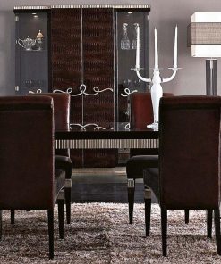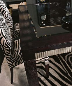 Прямоугольный обеденный стол, декорирован кожей. Столешница выполнена из стекла. Возможны другие варианты отделки.