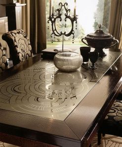 Прямоугольный обеденный стол, декорирован кожей. Столешница выполнена из стекла. Возможны другие варианты отделки.