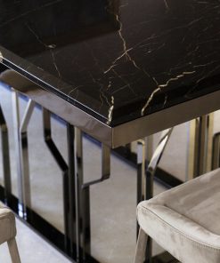Обеденный стол с металлическим основанием и прямоугольной мраморной столешницей. Возможен вариант со стеклянной или зеркальной столешницей. Возможны другие варианты отделки