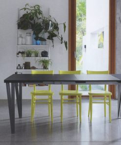 Обеденный раздвижной стол с прямоугольной столешницей и керамической деталью. Ножки выполнены из металла