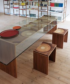 Обеденный стол с прямоугольной стеклянной столешницей и несущей структурой из многослойного массива дерева, состоящего из пяти разных пород