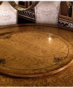 Круглый обеденный стол с вращающейся центральной столешницей. Декорирован резьбой ручной работы. Отделка ясень крашенный в светлый или темный орех.