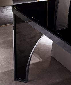 Обеденный стол с металлическим основанием и прямоугольной мраморной столешницей. Ножки декорированы стеклянными вставками. Возможен вариант со стеклянной столешницей. Возможны другие варианты отделки