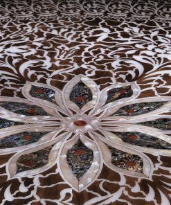 Круглый стол. Декорирован инкрустацией и резьбой. Возможны другие варианты отделки.