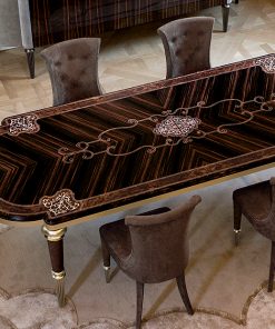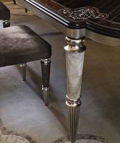 Обеденный стол с фигурной мраморной столешницей. Основание и ножки обиты кожей и декорированы вставками из литой латуни. Возможен вариант вставок из оникса, мрамора или кожи в цвет основания. Основание и ножки так же могут быть металлическими. Столешница может быть выполнена из эбенового дерева и декорирована инкрустацией. Возможны друге варианты отделки и обивки