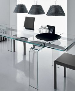 Раздвижной стеклянный стол с прямоугольной столешницей. Каркас выполнен из металла