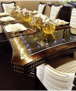 Прямоугольный обеденный стол. Столешница выполнена из стекла и декорирована светодиодами. Возможны другие варианты отделки.