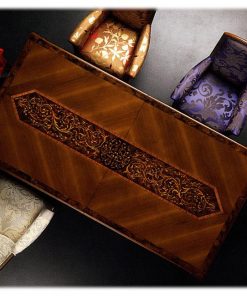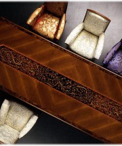 Прямоугольный раскладной стол. Инкрустация палисандровым деревом. По бокам узоры в виде ромба. Возможна отделка позолотой