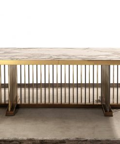 Обеденный стол с металлическим основанием и прямоугольной мраморной столешницей. Металлические стержни основания крепятся к базе из дерева. Столешница может быть из крашенного хрусталя, деревянной или зеркальной. Возможны другие варианты отделки