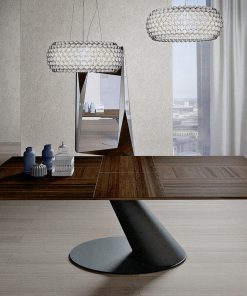 Раздвижной обеденный стол с металлическим основанием и деревянной столешницей. В раздвижном виде длина составляет 254 см, глубина 138. Возможны другие варианты отделки.