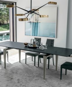 Раздвижной прямоугольный стол со стеклянной столешницей. Возможен вариант со столешницей из фарфора или керамики и другие варианты отделки.