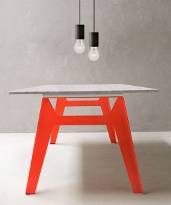 Прямоугольный обеденный стол. Столешница выполнена из мрамора, также можно выполнить из стекла или дерева (орех, крашенный белый). Цветовые варианты ножек: белый, красный, оранжевый, серый, коричневый, зеленый.