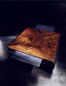 Чайный столик с двумя выдвижными полками, столешница из ореха с античным эффектом и металлической вставкой, два глубоких ящика, основание из лакированной липы. Возможны другие варианты отделки.
