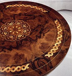 Круглый столик, украшенный инкрустацией в форме косы. Возможны другие варианты отделки.
